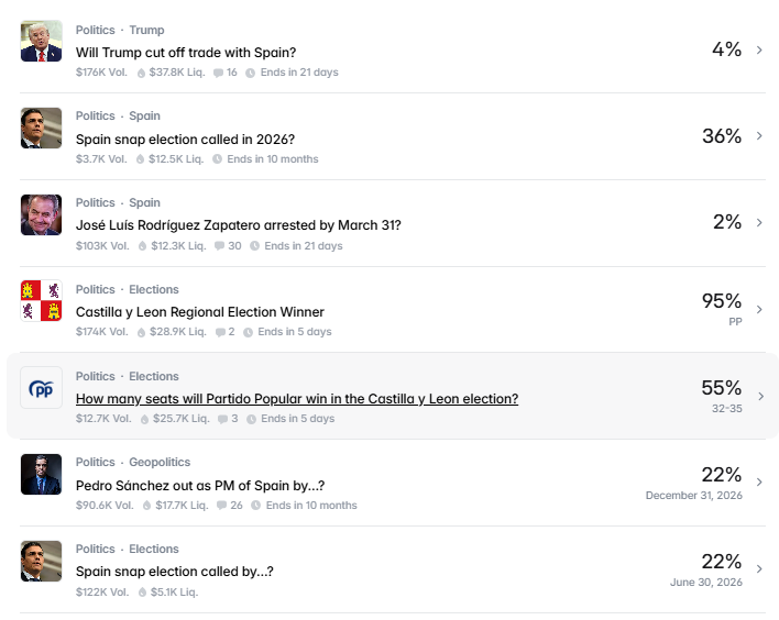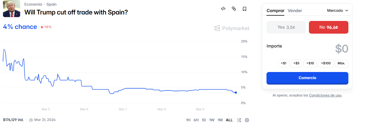 He echado un vistazo a ver si se apostaba algo sobre España y algo hay. La que tiene más bote sería la de si Trump corta el comercio con España antes del 31/03/2026.