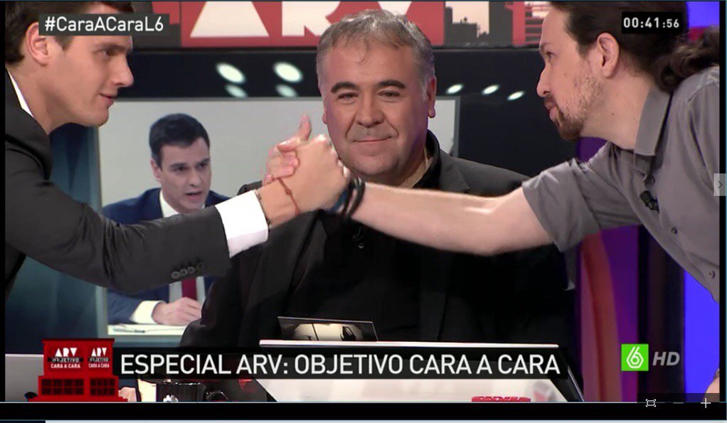 2. Y qué buenos Iglesias y Rivera machacando a los dos de común acuerdo en La Sexta justo a continuación. Qué manera tan rentable de contrarrestar la exclusión del debate.