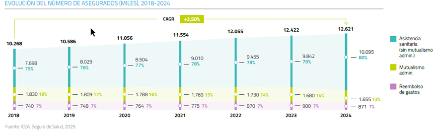 Como se observa en el gráfico gráfica el número de asegurados no deja de crecer a pesar de que el número de mutualistas de funcionarios se va reduciendo. Como es lógico su protagonismo se acentúa. En los últimos 15 años ha pasado del 31,7% de intervenciones quirúrgicas al 41,6% y del 20,6% de urgencias al 33,6%.