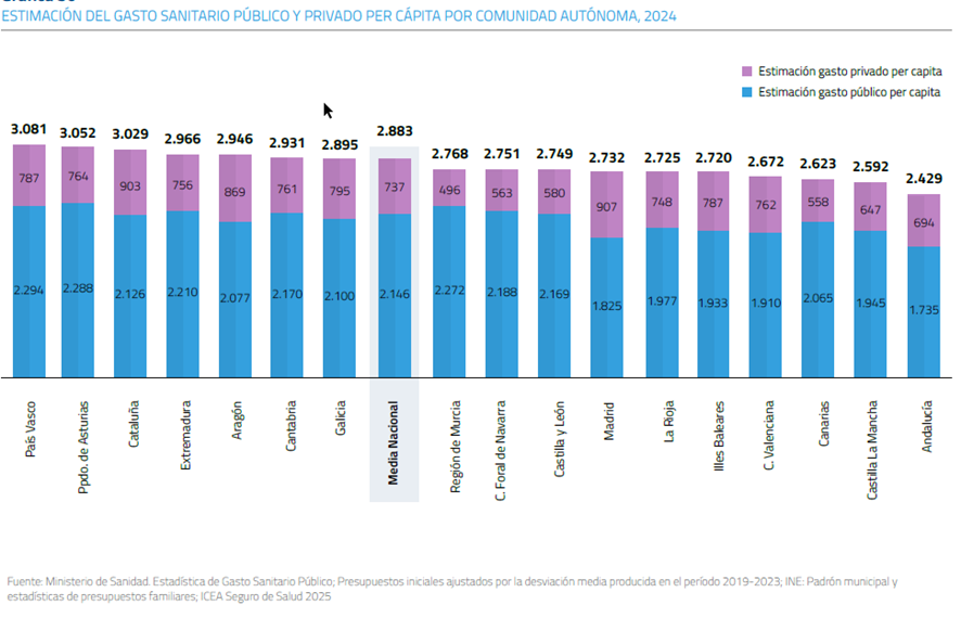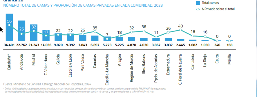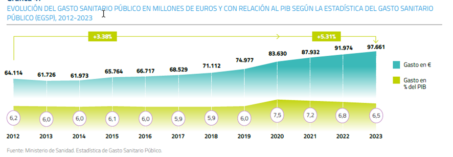 Y dentro de este gasto público en 2023 el 10,3% (10.023M€) se destinó a la colaboración público-privada, los conciertos. A pesar de ello 1 de cada 5 ciudadanos tiene seguro privado, 1 de cada 4 si se incluyen mutualidades de funcionarios.