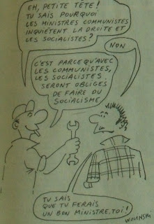 Me ha encantado la viñeta de Wolinksi http://3.bp.blogspot.com/-TDEOzi1JIsY/Tcj5BuTqH9I/AAAAAAAABf4/IfT_1mV_BiE/s320/1981-3-wolinski.jpg Está en francés, pero se entiende todo y si no se pregunta. Mi padre tenía un libro de este hombre, en castellano, tenía pq se lo cogí prestado a perpetuidad. Para otro día a ver si puedo escanear o hacer foto de la historieta de cómo repartir un pastel si no hay para todos.