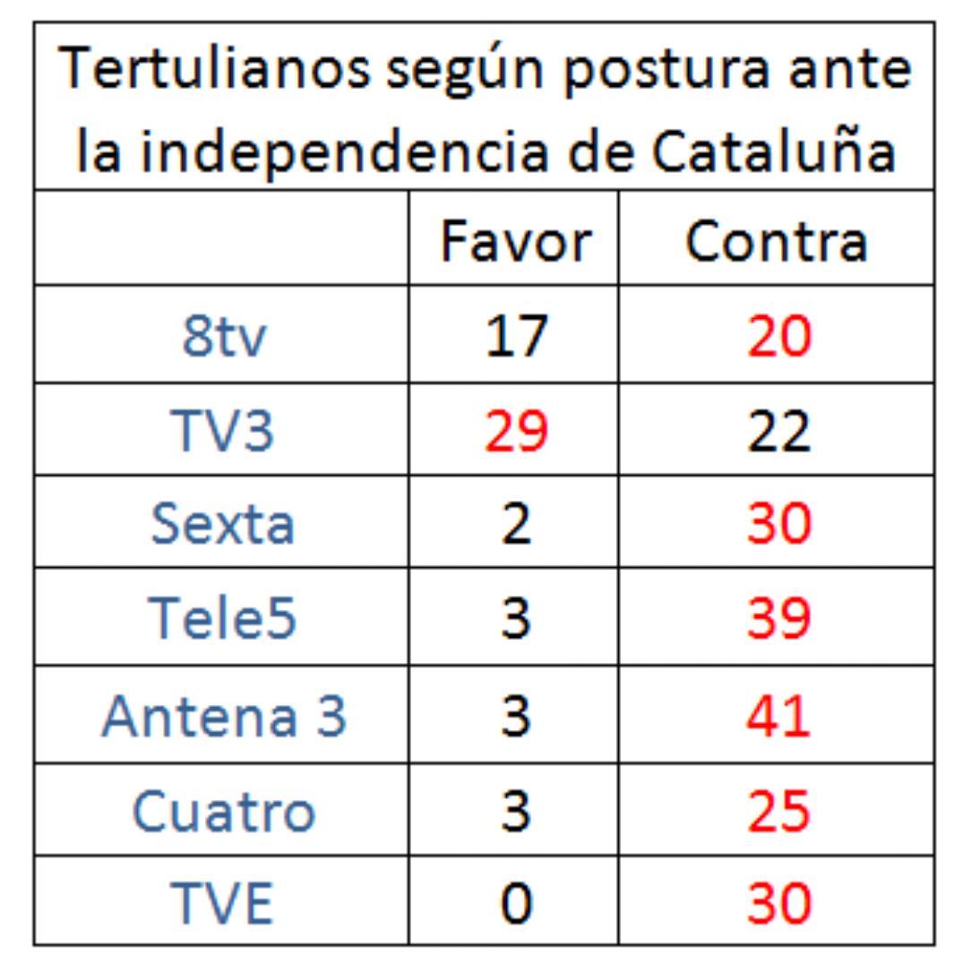 Les paso un gráfico con el estudio de tertulianos, comentaristas y posicionamiento con respecto a la independencia. Estudio hecho por Media cat. TVE la pagamos entre todos
